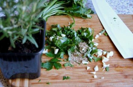 Dla nadania ostatecznego szlifu posiekać natkę i rozmaryn z czosnkiem i pieprzem z kolendrą.
