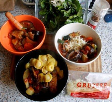 Moje propozycje podania warzyw są trzy – na początek! W jednej z miseczek dodałam parówki (nigdy nie kupujemy najtańszych!) albo inne kiełbaski. Można je ugotować oddzielnie albo poddusić z warzywami. Druga z miseczek zawiera warzywa plus włoskie pierożki. Jest ich teraz spora rozmaitość: są suszone i schłodzone, nadziewane prosciutto lub serem ricotta np. ze szpinakiem lub suszonymi pomidorami i wiele innych, o różnych kształtach i smakach. A warzywa kochają różne dodatki, w tym – sery. Toteż trzecia miseczka to duszone warzywa po prostu posypane tartym serem gruyère. Może to także być któryś z serów włoskich. Na przykład pecorino. Można go ostatnio znaleźć w wersji rzymskiej (romano), z Sardynii (sardo), z Toskanii (toscano). Bardzo lubię ich smaki, każdy jest naprawdę inny.