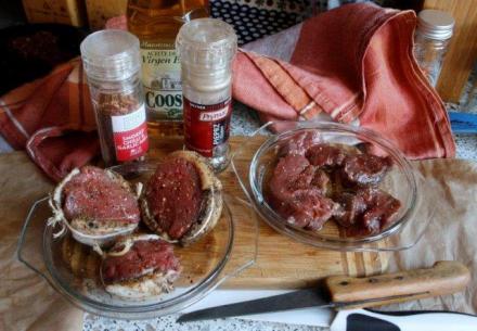 Moje befsztyczki usmażyłam na sposób tournedos. Zawinęłam je w plasterki skrojone ze słoniny natartej przyprawami (wkrótce pokażę sposób jej przyrządzenia). Ich obwiązywanie sznureczkiem (jest do kupienia na stoiskach z akcesoriami kuchennymi) może sprawić kłopot, ale jest przydatne – tak spreparowane kotleciki są szczególnie soczyste, no i okrągłe jak talarki.