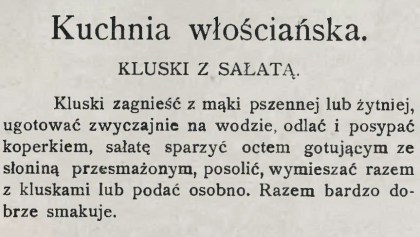 Jako się rzekło, słonina, jak oczywiście i smalec, były podstawową omastą polskiej kuchni. Przed wojną – w zasadzie już przed pierwszą – zaczęły jednak przegrywać z masłem. Także przecież tłuszczem zwierzęcym, ale uważanym za wykwintniejszy. Restauracje czy tzw. obiady domowe chwaliły się: gotujemy na maśle. Smak smalcu czy słoniny zaczęto uważano za wiejski, gminny, mało wytworny. W roku 1911 „Tygodnik Mód i Powieści”, wydawany w Warszawie jako „pismo illustrowane dla kobiet” pod redakcją Jan Skiwskiego, podawał garść przepisów dla „kuchni włościańskiej”. Zamysłem było podanie porad, czym karmić służbę, zwłaszcza tę wiejską, no i jak krzewić jedzenie pożywne i tanie, a przy tym zdrowe. Bo służba nie mogła przecież jadać tego samego, co państwo, a i zasoby finansowe na to nie pozwalały. Czytelniczki przysyłały więc propozycje tego rodzaju potraw. Na przykład dość nieoczekiwane kluski z sałatą: