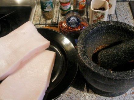 Słoninę pokroić w zgrabne paski. Korzenie rozetrzeć w moździerzu lub malakserze.