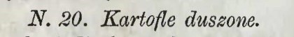 15–20 obranych i ugotowanych dnia poprzedniego kartofli, przepuścić przez maszynkę. W masę tę wbić dwa całe jaja dodać trzy łyżki słodkiej śmietanki, troszkę soli, szczyptę białego pieprzu i tyle pszennej mąki aby ciasto nie było zbyt twarde a znów nie przylegało do stolnicy. Z ciasta tego robić małe, niezbyt grube paluszki i na pół godziny przed obiadem ugotować je w wodzie osolonej jak zwykle na kluski. Oddzielnie w rondlu płaskim zrumienić łyżkę masła i ugotowane paluszki wybrane durszlakową łyżką na durszlak, dobrze osączone z wody, złożyć w to masło, przesypując suto tartym parmezanem. Paluszki te strząsnąć kilka razy i świeże, gorące wyłożyć w płaską ogrzaną salaterkę i zaraz na stół wydać.