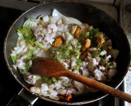 Ciasto rozłożyć na blaszce, podpiec w 200 st. C przez 15 minut (chyba że przepis na opakowaniu mówi inaczej). W tym czasie przygotować owoce morza. Zamrożone rozmrozić w kuchence mikrofalowej lub przelać na sitku wrzącą wodą. Odsączyć. Na patelni rozgrzać oliwę, wrzucić posiekane cebulę i szalotki. Gdy staną się szkliste, dołożyć owoce morza, a po chwili tymianek. Posolić. Podsmażyć mieszając.