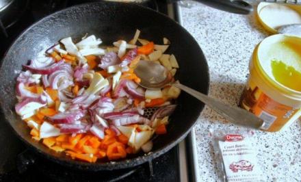 Warzywa i cebulę oczyścić, pokroić w paseczki. Masło rozgrzać, warzywa podsmażyć, posolić, popieprzyć, zalać winem. Wino powinno odparować co najmniej do połowy, a warzywa zmięknąć.