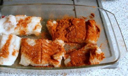 Dorsza pokroić, obtoczyć w przyprawach jak w panierce, posolić, odstawić.