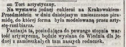 W pewnej cukierni widzieliśmy tort olbrzymich rozmiarów, na którym zamiast piramidy umieszczono grupę cukrową, złożoną z trzech figur. Największa figura, stojąca pośrodku, przedstawia Adama Mickiewicza, a dwie mniejsze Słowackiego i Krasińskiego. Jeżeli nasze „chwały” umieszcza się na fajkach, a nawet chustkach od nosa, i dlaczegóżby nie miały zdobić tortu i ostatecznie in efigie być zjedzonemi…