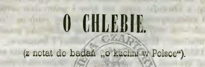 (…) Ów chleb co go na godach i przy zasiewie tak skromnie owies reprezentuje; jakże się świetnie przedstawia w czasie pożywania jajka wielkanocnego. Tu już chcąc tylko wyliczyć różne rodzaje tych przepysznych zastaw, trzeba by rzecz traktować z całą kucharską umiejętnością – toć i napisy dowcipnie przemawiają z bogato ozdobionych placków i ornamenta jakby rzeźby kunsztem zalecają się oku; wreszcie różną konjekturą przygotowały zręczne gosposie figliki i krotochwile ku uweseleniu gości. Choćby nazwać tylko przyszło każdy kołacz jego mianem, toby słownik powstał z owych: bab petynetowych (dziurkowanych), lukrowanych, migdałowych, razowych, obartuchów; to znów jajeczników i serowców a maczniczków i mazurków w tysiącznych odmianach.