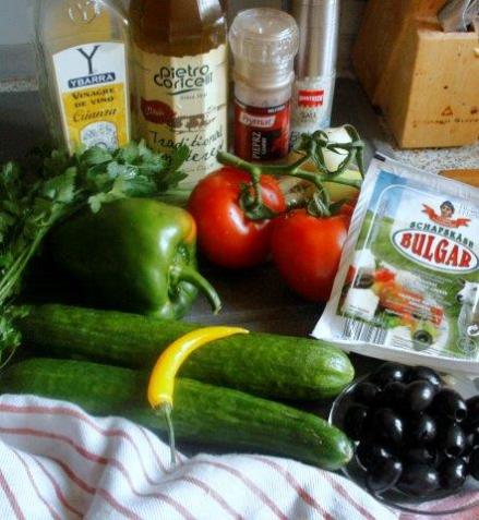 Warzywa, myjemy, kroimy. Paprykę można podpiec i obrać ze skórki. Na spodzie salaterki układać pokrojone nie za grubo pomidory, posypać je zieleniną, półplasterkami cebuli, papryką słodką. Przyprawić bardzo ostrożnie solą i bez umiarkowania pieprzem. Skropić oliwą i bardzo oszczędnie octem. Na to położyć pokrojone plasterki ogórka. Posypać je ostrą papryczką, także przyprawić. Na to znów warstwa pomidorów z oliwkami, papryką i cebulą. Takich warstw może być kilka – w zależności od ilości warzyw. Całość posypać startym serem, posypać pieprzem i ostrą papryką z młynka (niekoniecznie wędzoną). Przed podaniem skropić oliwą lub olejem.