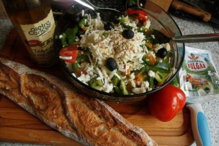 Oliwę lub olej warto także podać na stół, jak i pieprz oraz paprykę. Sałatkę każdy może sam dodatkowo doprawić. Świeże pieczywo i dobre wino dopełnią smaku. Jakie wino? Właściwie i schłodzone białe, i czerwone będą pasowały. A kto lubi, może do sałatki wypić zimne piwo. Lub zjeść gęsty bułgarski jogurt. Wedle uznania.