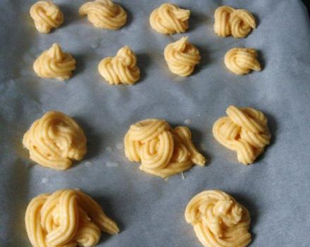 Do przestudzonej masy dodawać kolejno po jednym jajku. Każde następne dodaje się po wtarciu w ciasto poprzedniego. Rękawem cukierniczym, szprycą lub po prostu dwiema łyżkami wykładać ciasto na papier do pieczenia lub blaszkę wysmarowaną masłem.