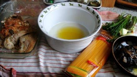 Nic dodać. Dlatego zresztą lubię komponować zapiekanki i nie martwię się z pozostałości po dużym indyku, gęsi, rostbefie, schabie. Tym razem po rodzinnym obiedzie zostały kawałki pieczonego indyka: udko, kawałki piersi, mięso od grzbietu. Trzeba je pokroić w drobną kostkę lub cienkie plasterki i – uruchomić wyobraźnię. Do wykorzystania miałam ponadto spaghetti kukurydziane, a więc produkt bezglutenowy. Ostatnio jest moda na unikanie glutenu, podobno nie jest zbyt zdrowy (Hm? Czy dla każdego?). Z zamrażalnika wyjęłam także jeszcze inne resztki: ugotowane suszone grzyby; pozostałość z farszu do pierogów. Do dzieła!