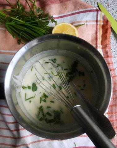 biały sos (masło, mąka, mleko lub śmietana i bulion warzywny, sól, biały pieprz, gałka muszkatołowa, sok z cytryny)