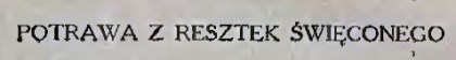 Wszelkie resztki białego mięsa: indyka, cielęciny, kury, schabu, lub pieczeni wieprzowej, pokrajać w cienkie plastry i ułożyć na metalowym, lub ogniotrwałym półmisku, przekładając każdy cieniuchnym plasterkiem słoninki od szynki gotowanej. Na kilo takiego mięsa, zasmażyć na biało dwie łyżki mąki z łyżką masła, rozprowadzić litrem dobrego mleka, lub, co smaczniej, śmietanki, zagotować, osolić do smaku, wsypać odrobinę białego pieprzu, na koniec noża utłuczonego kwiatu muszkatołowego, pokryć tem mięso, osypać tartą bułeczką, zmieszaną z ostrym serem, (ser nie jest konieczny). Na wierzch położyć parę kawałeczków masła i wstawić w gorący piec na minut kilka, aby się wszystko dobrze rozgrzało i na wierzchu uformowała rumiana skórka. Sosy, pozostałe po upieczeniu mięs i starannie przechowane, zmieszać, zdejmując z nich wszelki tłuszcz, – półtorej szklanki takich zmieszanych sosów rozgrzać i podać oddzielnie w sosjerce.