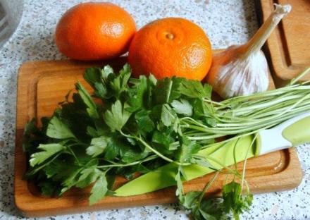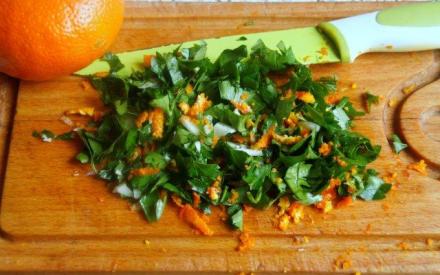 Przesiekać natkę, czosnek i skórkę startą z mandarynki na grubej tarce.