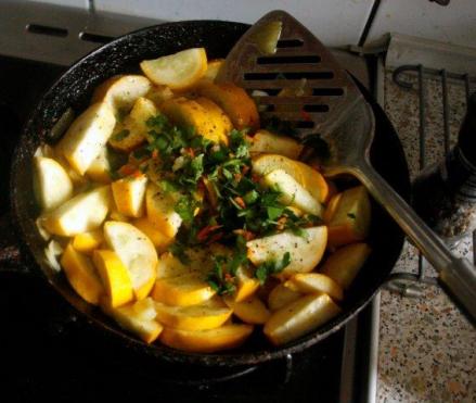 Dzisiaj mamy cukinie już nie tylko zielone. Kupiłam, jak widać, tę o skórce żółtej. Przyrządziłam z niej najprostszą potrawę duszoną. Może być dodatkiem do mięsa, ryb lub omletu, można ją jeść samodzielnie – tylko z jakimś pieczywem i zsiadłym mlekiem, kefirem lub jogurtem. Może przy tym być schłodzona. Ale to w dzień upalny. Przy naszym maju – cukinię woli się na ciepło. Przyprawiłam ją w stylu włoskim, ale po mojemu. Z wymyśloną przez siebie gremolatą. Gremolata (u Halbańskiego jej nie ma!) to warzywna przyprawa włoska do zup, sosów, mięs itp. Jej składniki to posiekane natka pietruszki, czosnek i skórka z cytryny. U mnie zastąpiła ją skórka z mandarynki.