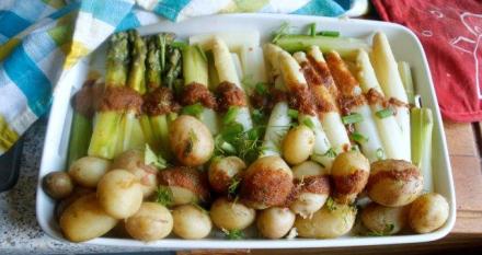 A jak je gotować? Ja gotuję zwykle na parze, lekko soląc i słodząc. Czasami, pod koniec szparagowego sezonu, także je grilluję (pyszne są owinięte w plasterek szynki dojrzewającej). Ale najbardziej lubię te klasyczne, podane po polsku czyli z bułeczką zasmażoną w maśle (przypominam: najpierw trzeba zrumienić bułeczkę, potem, dodać masło; najlepiej klarowane – nie będzie się pienić). Albo po prostu z samym świeżym masłem. Pyszne są także szparagi na zimno, podane z oliwą. Lubią zielone dodatki: koperek, natkę pietruszki, młody szczypiorek. A także towarzystwo innych młodych jarzynek. Ja podałam je z młodymi ziemniaczkami, tymi malutkimi, których nie trzeba obierać, wystarczy je umyć i ewentualnie obetrzeć ze skórki. Jeżeli jeszcze opiszę w tym sezonie szparagi, postaram się o ambitniejsze propozycje. Ale na powitanie sezonu szparagowego zawsze są u mnie szparagi à la polonaise. Potem, gdy się znudzą, szukam innych pomysłów.