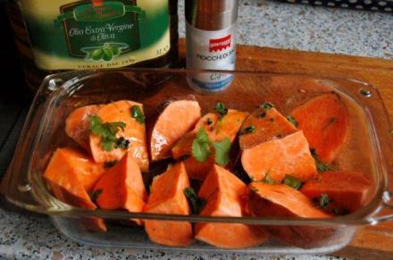 A więc warzywo to szacowne. Jak napisano, głównie się je piecze. Tak też zrobiłam. Pieczenie jest bardzo proste. Czas zależy od wielkości kawałków warzywa. Pieką się jednak krócej niż ziemniaki.
