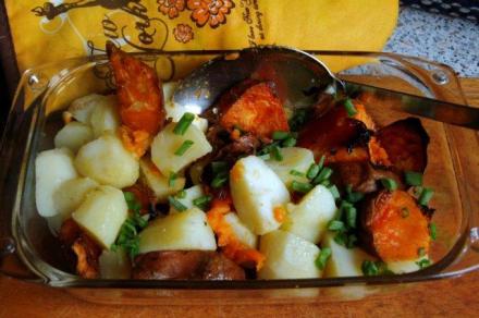 Zdarza się, że mamy w domu osoby nie lubiące nowinek. Kochają piosenki, które już kiedyś słyszeli, do ust biorą tylko to, czego smak znają od lat. Na słodki smak tych dziwnych ziemniaków oraz ich żywy kolor mogą się krzywić. Połączmy więc oba warzywa. Piekące się pataty można przełożyć obgotowanymi przez 5 minut ziemniakami. Taką zapiekankę posypałam szczypiorkiem, bo smak kolendry mógłby nie być atrakcyjny dla szacownej Babci, Teściowej, Stryja (niepotrzebne skreślić) o znanych nam dobrze i tradycyjnych upodobaniach smakowych.