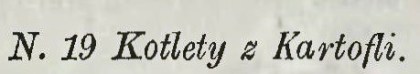 Ugotować miękko obrane kartofle, utrzeć z masłem, przetrzeć przez durszlak na miskę, wbić parę jaj całych, opieprzyć i robić kotlety, posmarować jajkiem, osypać bułeczką tartą i smarzyć [tak pisano!] na klarowanem maśle. Sos cebulowy podaje się osobno zrobiony w sposób następujący: Kilka kawałków cukru umoczyć w wodzie, zrumienić w rondelku, włożyć kawał masła utartego z mąką podlać rosołem, wrzucić kilka dużych cebul drobno usiekanych i gotować aż będą miękkie, w końcu wlać octu zagotować i przez sito przetasować. Kto chce mieć sos ostrzejszy, niech doda łyżeczkę musztardy.