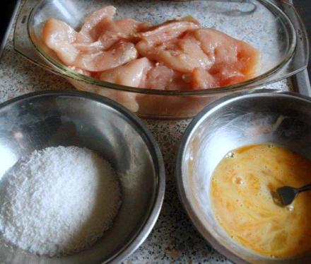 Wiórków kokosowych jako panierki użyłam do kotlecików z tzw. polędwiczek z indyka. Są to delikatne kawałki piersi. Lekko posolone obtoczyłam w jajku roztrzepanym z mlekiem, a potem w wiórkach wymieszanych z mąką pszenną. Smaży się je z dużym wyczuciem, kokosowe wiórki łatwo się przypalają. Lepiej więc nie rozgrzewać tłuszczu za mocno. Użyłam oleju, ale może to być i masło klarowane. Gdy nie mamy pewności, czy sznycelki są dosmażone, przykryjmy patelnię pokrywką lub wstawmy usmażone do piekarnika. Wtedy na pewno w środku „dojdą”.