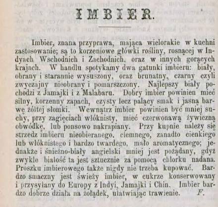 Nie podaje jednak, do czego używano imbiru. Nieco dokładniej opisywano imbir w jednym z gospodarskich kalendarzy wydawanych u schyłku wieku XIX przez Lucynę Ćwierczakiewiczową, w tym z roku 1896.