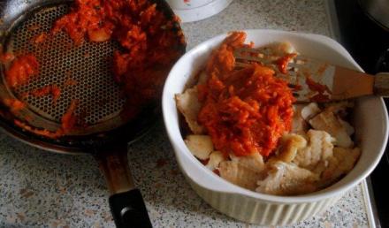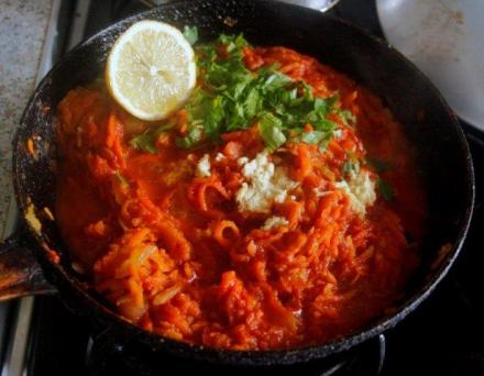 W patelni o grubym dnie obsmażyć na oleju warzywa oczyszczone, starte na tarce lub w robocie kuchennym. Korzeń imbiru zetrzeć drobno, dodać do warzyw razem z pomidorami, wymieszać, doprawić kolendrą (jedną i drugą), sokiem z cytryny, startą z niej skórką oraz solą, papryką i cukrem. Gdyby sos warzywny był zbyt gęsty i przywierał do patelni, podlać go wodą. Dusić aż warzywa będą miękkie.