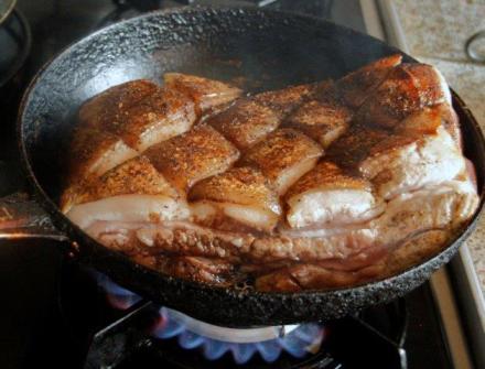 Boczek wyjąć co najmniej pół godziny przed pieczeniem. Rozgrzać mocno patelnię o grubym dnie, boczek włożyć najpierw skórą do dołu, obsmażyć, potem smażyć z drugiej strony. Wytropiony tłuszcz zlać, boczek można odtłuścić na papierze kuchennym.