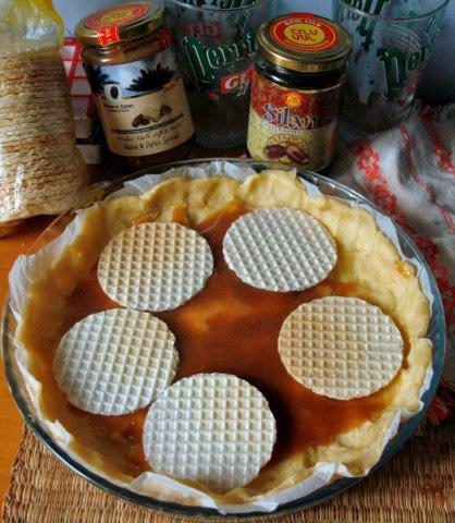 Ciastem wyłożyć okrągłą foremkę do tarty. Wierzch posmarować kremem daktylowo-chałwowym, wyłożyć wafelkami.