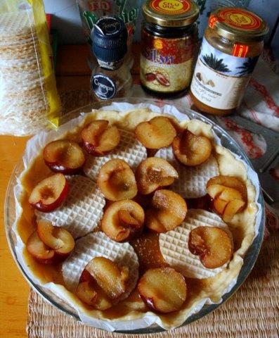 Śliwki przepołowić, wyjąć z nich pestki. Na waflach ułożyć połówki śliwek skórką do dołu.