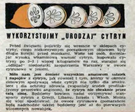 A oto, jak radośnie w tym samym roku opisywano cytryny. Zapewnienie, że ich nie zabraknie, było chyba jednak na wyrost. Cytryn brakowało przez cały czas PRL-u. I to wcale nie dlatego, że ludzie kupowali ich po 2–3 kilogramy i sami byli sobie winni! Na produkty spożywcze państwu wciąż brakowało cennych dewiz. Budowano fabryki kosztem konsumpcji.