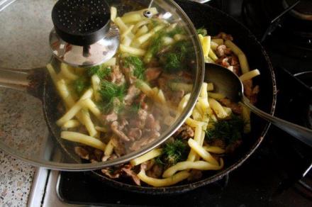 Gdy mięso zmięknie, dodać fasolkę i poddusić razem. Kto chce, może wtedy dodać śmietanę. Tuż przed podaniem dorzucić posiekany koperek i nać selera.