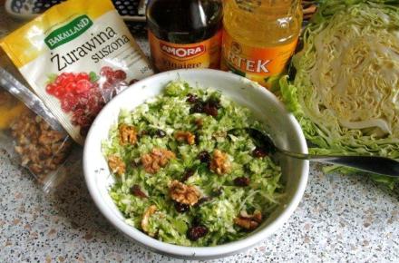 Kapustę zetrzeć na tarce lub w robocie kuchennym. Posolić, dostawić na kwadrans, ew. odcisnąć sok. Wymieszać z żurawiną i orzechami włoskimi, doprawić olejem i odrobiną octu. Do smaku doprawić cukrem i pieprzem.