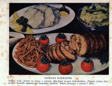 Kto ma nieco więcej czasu, a przy tym woli potrawy bardziej dietetyczne, a więc nie smażone, może wypróbować klasyczną rybę gotowaną. Przepis podaję za Elżbietą Kiewnarską i jej pozycją z lat 30. XX wieku pt. „200 obiadów”. Ilustracja pokazuje, jak wyglądał przedwojenny elegancki obiad z łososiem. Przygotowanie zajęło więcej niż pól godziny, za to mogę ręczyć.