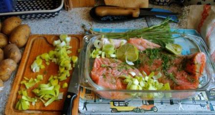 Łososia, jeżeli jest ze skórą, oskrobać z łuski. (Kto skóry nie lubi, niech kupi bez niej lub ją zdejmie). Koperek posiekać, pora pokroić w cienkie plasterki. Natrzeć filety nim i solą. Odstawić na kwadrans (np. na czas przygotowania ziemniaków).