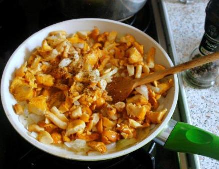 Kurki oczyścić i szybko umyć, osuszyć w wirówce do sałaty, większe pokroić. Cebulę drobno pokroić, zeszklić na maśle klarowanym. Dorzucić kurki, dusić do ich miękkości, posolić, posypać świeżo mielonym pieprzem.