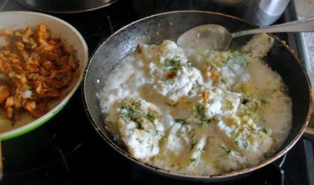 Usmażone z obu stron filety i zasmażone migdały zalać mlekiem lub śmietaną. Posolić do smaku. Przed podaniem posypać koperkiem.
