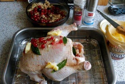 Po pół godzinie kurczaka odwrócić piersiami do dołu. Na grzbiecie ułożyć porzeczki i laurowe listki. Temperaturę zmniejszyć do 180 st. Dopiekać kurczaka polewając płynem spod kratki. Kurczak po pól godzinie powinien być miękki i mieć zarumienioną skórkę (zależy to od wielkości, większy może się piec nawet jeszcze godzinę). Gdyby skórka rumieniła się za bardzo, przykryć ją folią aluminiową.