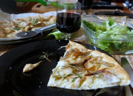 Co z kuchni włoskiej? Proponuję zestaw klasyczny: focaccia i sałata. Ciasto na focaccię (może spolszczyć na „fokaczię”?) już kiedyś opisywałam, ale w sklepie można poszukać ciasta gotowego, schłodzonego. Zwykle trzymam je w lodówce na wypadek napadu lenistwa lub konieczności przygotowania szybkiego obiadu. Rzecz we dodatkach. W zasadzie focaccia to drożdżowy placek podawany jako tzw. czekadełko lub do innych potraw. Nam wystarcza za lekkie danie obiadowe. Zwłaszcza gdy jest obłożona jakimiś dodatkami. Oszczędnie. Wystarczą np. oliwki. Wystarczy jakiś ser. Ale wypróbowałam dodatek jeszcze inny, białkowy. W sam raz na obiad lub lekką kolację.