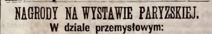 Z ciekawości popatrzmy, jakie polskie wyroby uzyskały najwyższe odznaczenia. Medale złote otrzymali: Marya hr. Potocka z Wysokiego za produkty rolne, Krall i Seidler za fortepiany, Kerntopf za fortepiany, „Soczewka” za papier, Zbiorowa kolekcya wełny z Królestwa, Wojciech hr. Poletyłło za wełnę, „Hermanów” za cukier, „Konstancya” za cukier, Mieczysław Epstein z Dołhobyczewa za zboże, Rechniewski za aparaty elektrotechniczne, Fraget za wyroby platerowane, „Huta bankowa” za żelazo i stal. Ogółem medali złotych przyznano 12!