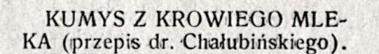 Szklankę mleka zbieranego, szklankę przygotowanej wody, łyżkę cukru miałkiego, łyżkę rozpuszczonych drożdży i łyżeczkę cukru mlecznego. Wszystko zmięszać razem. Wlać w butelkę mocną, tak, aby korek tkwił do połowy i zostawić na 12 godzin w spokoju, mącąc co dwie godziny. Po 12 godzinach wbić korek, zawiązać szpagatem i trzymać leżąco w piwnicy 24 godzin, po upływie których kumys gotów jest do picia.