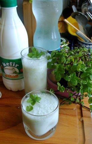 Zmiksować kefir ze startym ogórkiem i wodą mineralną. Solidnie posolić do smaku. Podawać od razu, póki się pieni, posypany listkami świeżej mięty.