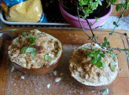 Połówki bakłażanów wypełnić obficie. Na każdej umieścić kawałeczek masła wielkości włoskiego orzecha i stołową łyżkę wody. Piec w średnim piecu przez pół godziny.