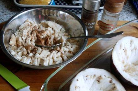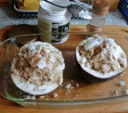 Nie byłabym sobą, gdybym tej recepty nie dopasowała do swojego smaku. Do farszu z posiekanych środków warzywa dodałam sypkie przyprawy korzenne: cynamon i goździki (te oszczędnie!). Zastosowałam cukier brązowy. Do pieczenia zaś zamiast masła wzięłam olej palmowy. Przez lata wyklęty, ostatnio uważany za tłuszcz bardzo zdrowy!