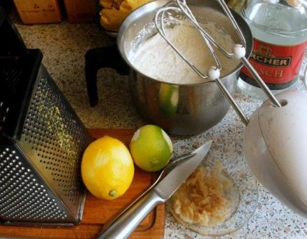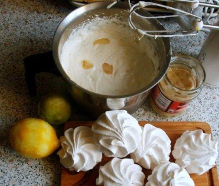 Śmietankę ubić na sztywno. Utrzeć z dodatkami: z cukrem, skórkami startymi z cytrusów, kirschem i imbirem. Wetrzeć pokruszone bezy oraz listki melisy.
