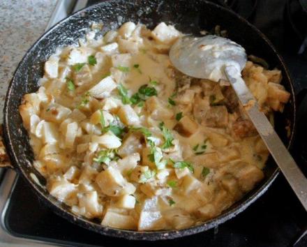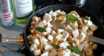 Składniki użyte przez mnie widać na zdjęciach. Wzięłam i białe wino, i śmietanę kremową, delikatny kwiat soli z Cypru, a dodatkowo do duszenia liście laurowe. Zamiast zaś masła – olej kokosowy. Nadał potrawie delikatnego i intrygującego posmaczku.