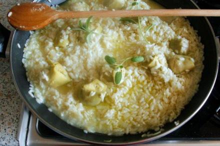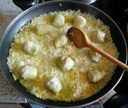 Ryż zalać wywarem z karczocha, mieszać, aż zostanie wchłonięty. Następnie dolewać wywar warzywny lub/i wino. Jeżeli używa się samego wina, doprawić solą i pieprzem. (Jeżeli płynu zabraknie, można dodać wody). Trzymać na ogniu ok. 15–20 minut, aby ryż wchłonął płyn i zmiękł. Wtedy dołożyć serca karczochów.