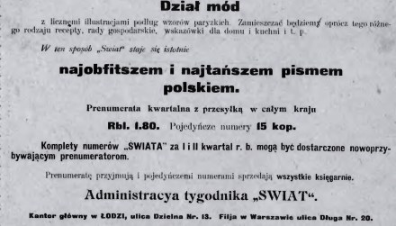 Wskazówka pochodzi z tygodnika „Świat”, który niedawno już w blogu przybliżyłam. Było to pismo „tygodniowe illustrowane”, „poświęcone literaturze, krytyce, sztuce i naukom”, a wydawane w Łodzi w roku 1901. Oprócz tych poważnych stron miało także mniej poważne, obliczone na przyciągnięcie pań zajmujących się gospodarstwem i zawsze chętnie czytających o rygorach mody.