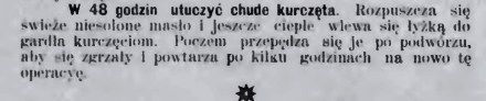 Z tamtych zamierzchłych czasów znalazłam ciekawą poradę, jak nasze praprababcie osiągały tak wtedy cenioną tłustość kurcząt. Pokazuje ona zarazem, jak inne były standardy etyczne tamtej epoki od naszych. Osobom wrażliwym odradzam czytanie tej krótkiej porady: