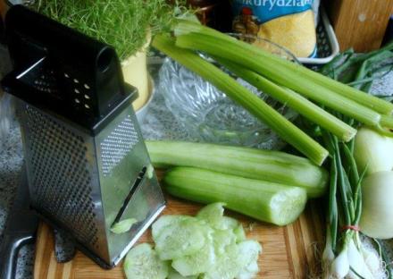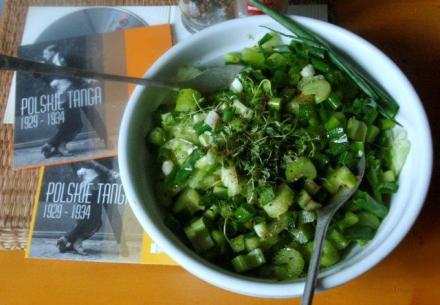 Do tego niech będzie mizeria. Ale nieco inna niż proponowana w roku 1901. Jeszcze nowocześniejsza. Najpierw przygotujmy składniki: świeże ogórki, seler naciowy, dymkę lub młodą cebulę, świeże zioła. A także oliwę i dobry ocet do doprawienia surówki.