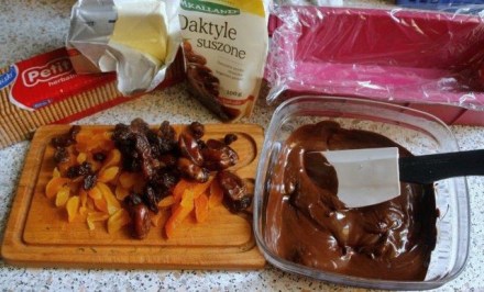Jakie bakalie dajemy do bloku? Jakie mamy, lubimy i jakie nam nie szkodzą. Ponieważ moja siostra jest uczulona na orzechy, rzecz jasna ich nie dawałam. W moim wyrobie były tylko suszone morele, daktyle i rodzynki, te duże. Mogą być wszystkie owoce suszone lub kandyzowane, migdały, dowolne orzechy. Pole do eksperymentów jest szerokie. Kto chce, może wziąć inną czekoladę. Gdy będzie mleczna, nie potrzeba masy dosładzać. Umówiłam się, że następnym razem wezmę właśnie czekoladę mleczną i same herbatniki, bez bakalii. Może blok będzie mniej elegancki w smaku, ale bardziej będzie przypominał tamtego biedaka z dawnych czasów.